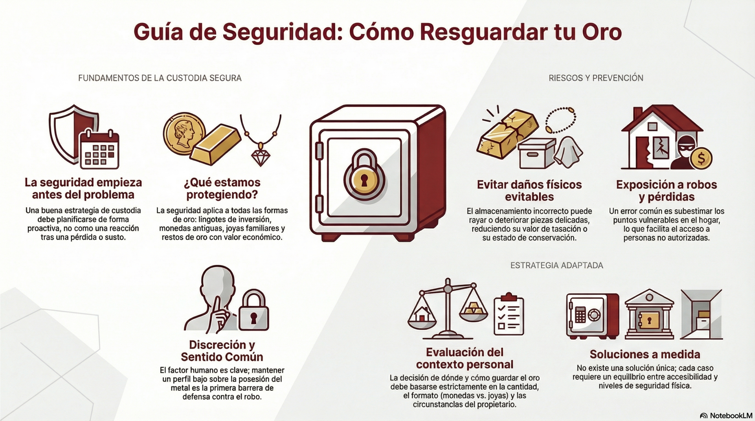 Otro fallo frecuente es comentar su existencia con demasiada naturalidad. Aquí debemos ser claros: no decirle a nadie que tenemos oro es una de las medidas de seguridad más eficaces y más infravaloradas. Muchas incidencias no proceden de una búsqueda aleatoria, sino de información que circula entre conocidos, visitas, empleados ocasionales o terceros que no deberían saberlo. La discreción no es paranoia; es prevención.